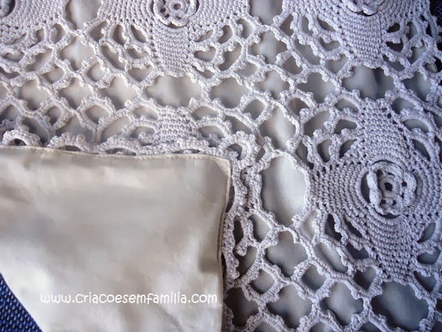 Dia desses, quando estava fazendo essa luminária, a amiga Flávia veio me visitar. Comentou que a mãe dela estava fazendo umas arrumações e que ia me trazer algumas coisas pra aproveitar. Trouxe várias peças, entre elas duas proteções de braço de poltrona – e pediu pra transformar em capa de almofada. Calculo que tenham mais que 40 anos, pois foi a sogra da mãe da Flávia que as fez.