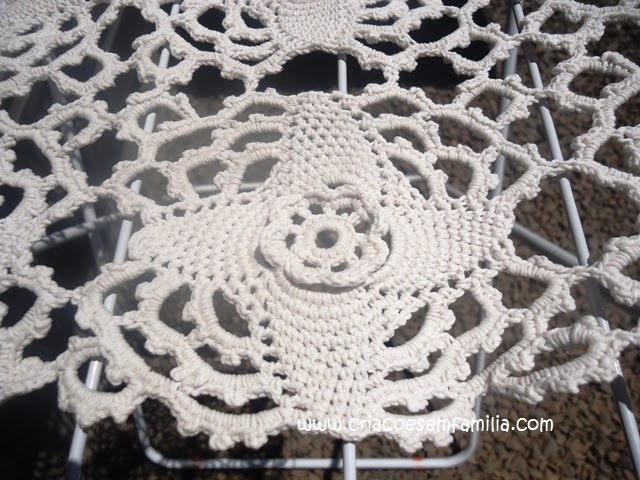 2 – Engomar foi importante para que a peça fique em seu tamanho natural e o desenho fique bem visível. Vejam no detalhe a beleza do trabalho! Quando secou estiquei manualmente cada um dos quadradinhos.