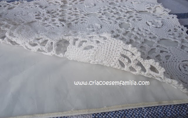 4 – Coloquei a peça sobre o tecido para alinhavar. Percebam que com a dobra a parte posterior da capa (o tecido) fica uma pouco menor que a peça. Isso valoriza os “biquinhos” do crochê.