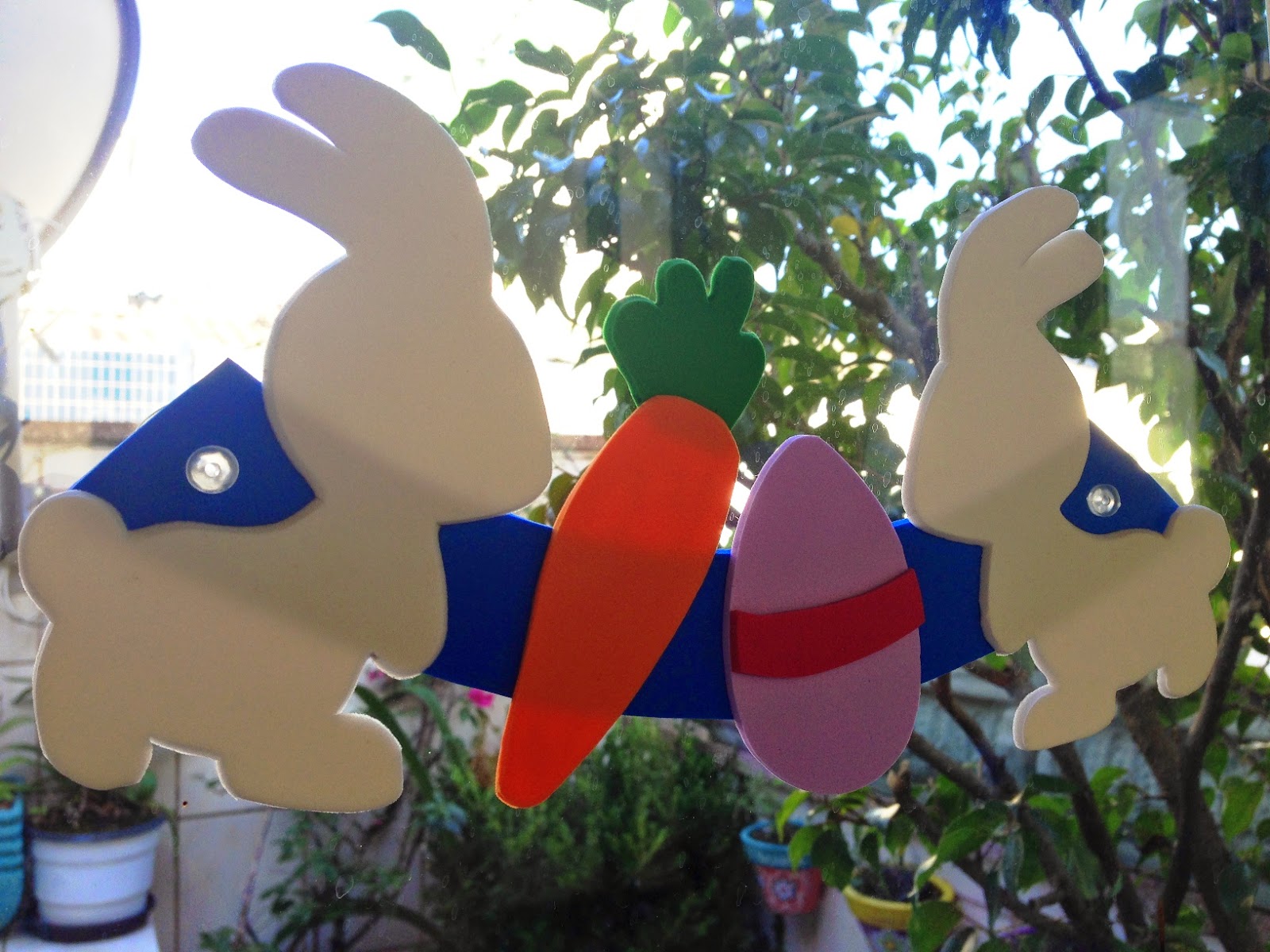 Praticamente tudo que mostro foi feito por mim ou alguém da família.Tem este enfeite de janela de EVA, que pode ser feito com cartolina também!